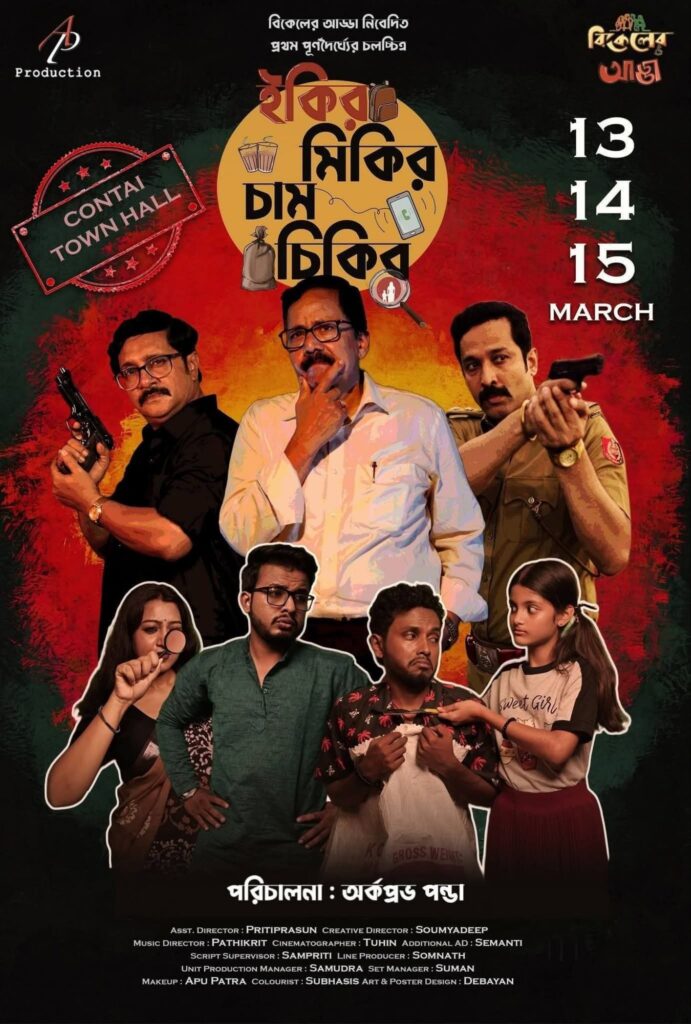 জেলার মহকুমা শহর হল কাঁথি। ঐতিহাসিক শহর হলেও মেট্রোপলিটন শহর থেকে অনেকটাই পিছিয়ে এই শহর। এর মধ্যেই শহরের কলাকুশলীদের নিয়ে পূর্ণ-দৈর্ঘ্যের সিনেমা বানিয়ে নজির গড়ল অর্কপ্রভপণ্ডা। কাঁথির এই তরুণদের স্বপ্নের ছবি ‘ইকির মিকির চাম চিকির’। আগামী ১৩ মার্চ মুক্তি পাচ্ছে। কাঁথিতে টাউন হলে বড় পর্দায় দেখানো হবে এই সিনেমা। তবে রিল-লাইফে ঝড় তুলতে চলেছে সদ্য কৈশোর পেরিয়ে যৌবনে পা রাখা কাঁথির একঝাঁক প্রতিভাবান যুবক-যুবতী। তাঁদের সঙ্গে রয়েছেন কাঁথির প্রতিথযশা কয়েকজন গুণী মানুষও। সাহস, ভালোবাসা আর স্বপ্নের মেলবন্ধনে তৈরি হয়েছে এই নতুন ছবি- ‘ইকির মিকির চাম চিকির’। স্থানীয় কলাকুশলীদের নিয়ে নির্মিত এই ছবি শুধুমাত্র একটি চলচ্চিত্র নয়, বরং কাঁথির তরুণ প্রজন্মের স্বপ্নপূরণের এক সাহসী উদ্যোগ। সীমিত বাজেট ও ক্ষুদ্র পরিকাঠামোর মধ্যেও নিজেদের মেধা, পরিশ্রম ও আত্মবিশ্বাসকে পুঁজি করে তাঁরা তুলে ধরতে চেয়েছেন জীবনের বাস্তব গল্প-বন্ধুত্ব, ভালোবাসা, সংগ্রাম ও স্বপ্ন ও পরিণতির কথা।